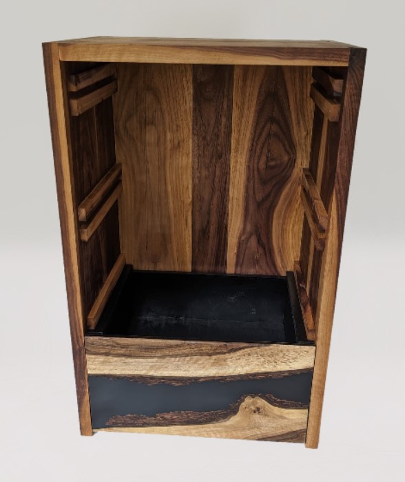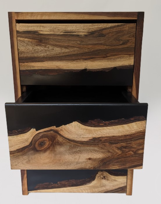 Kast met drie laden waarvan de fronten zijn gemaakt van een combinatie van notenhouten schaaldelen en zwarte epoxy. Geïnspireerd op een kolkende rivier.