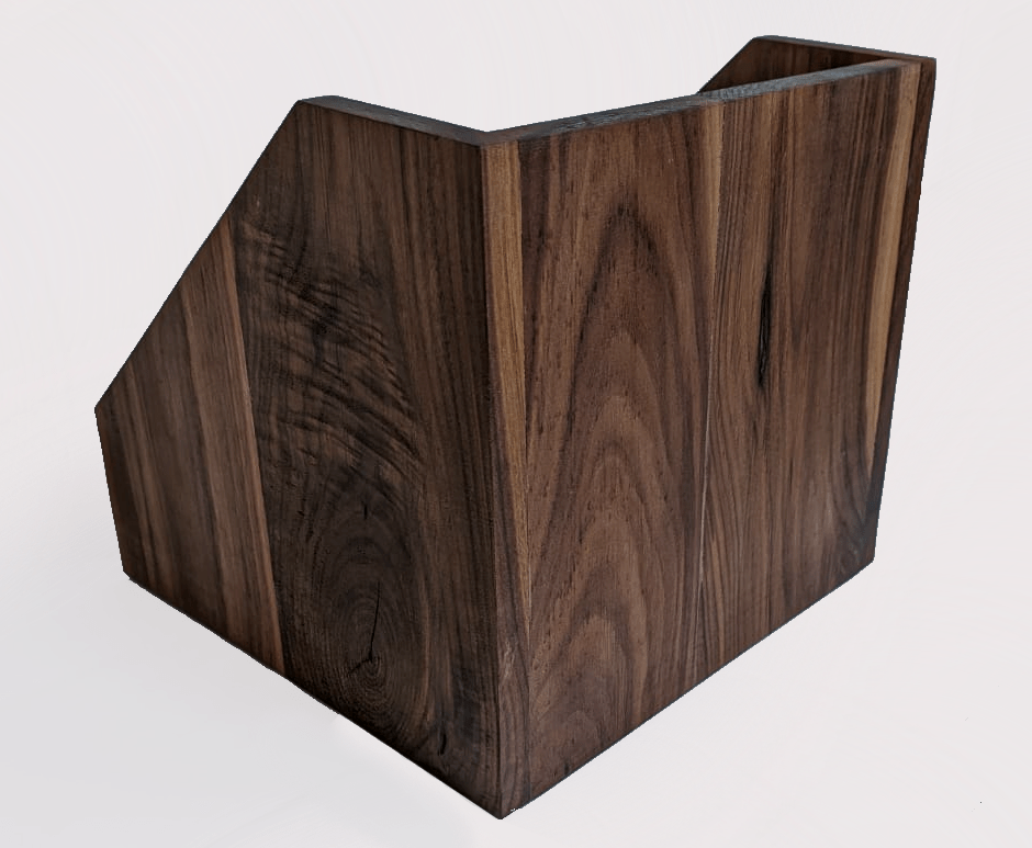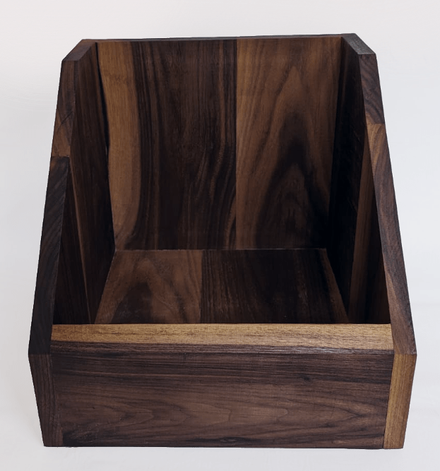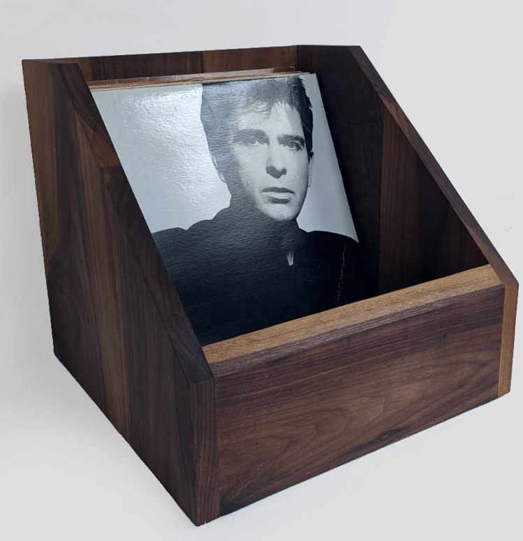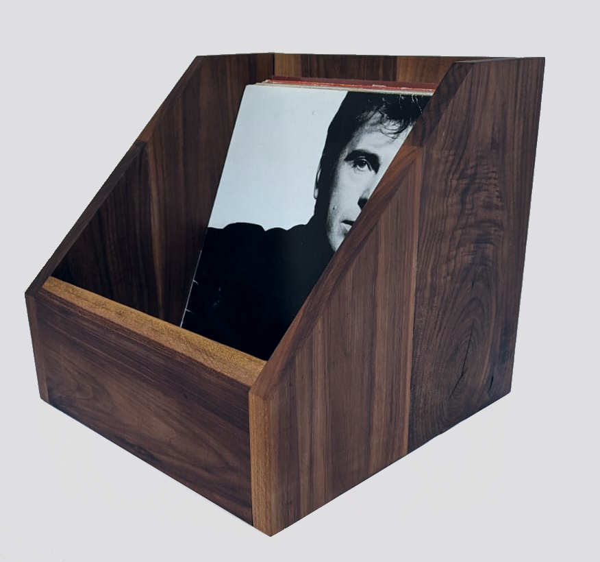 Notenhouten bak om elpeehoezen in te bewaren en tentoon te stellen. Biedt ruimte voor 60 standaard hoezen.