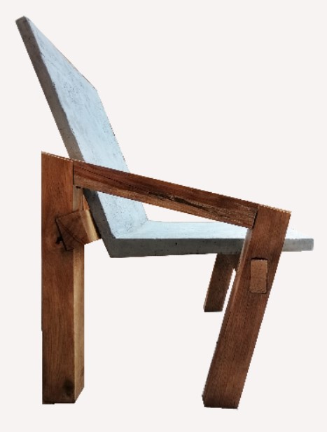 Stoel met voetenbankje voor buiten. Het frame van eikenhout is verbonden door middel van zwaluwstaart- en pen-gat verbindingen (geen lijm!) en de dunne zitting van beton is versterkt met kunststofvezels.