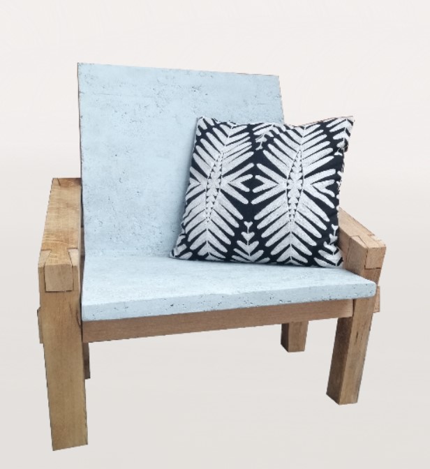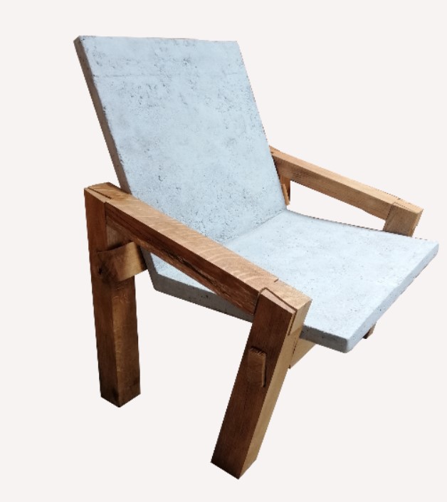 Stoel met voetenbankje voor buiten. Het frame van eikenhout is verbonden door middel van zwaluwstaart- en pen-gat verbindingen (geen lijm!) en de dunne zitting van beton is versterkt met kunststofvezels.