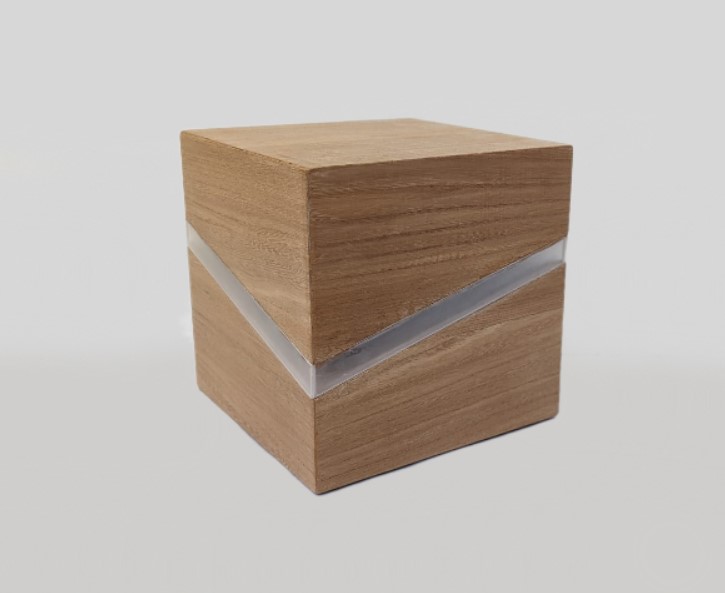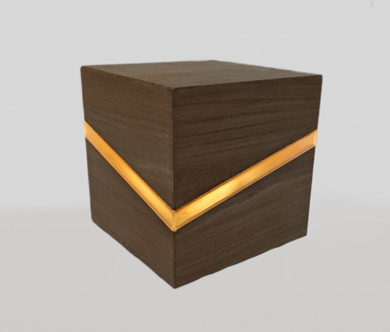 Een kubus vervaardigd uit verstek gezaagd hout, met aan alle zijden een diagonale lichtstreep. De kubus bestaat uit twee delen die uit elkaar gehaald kunnen worden om de lamp (E14) te vervangen. Het snoer is wit.
