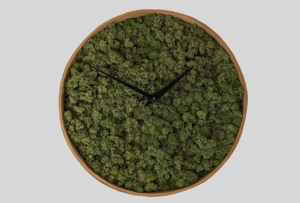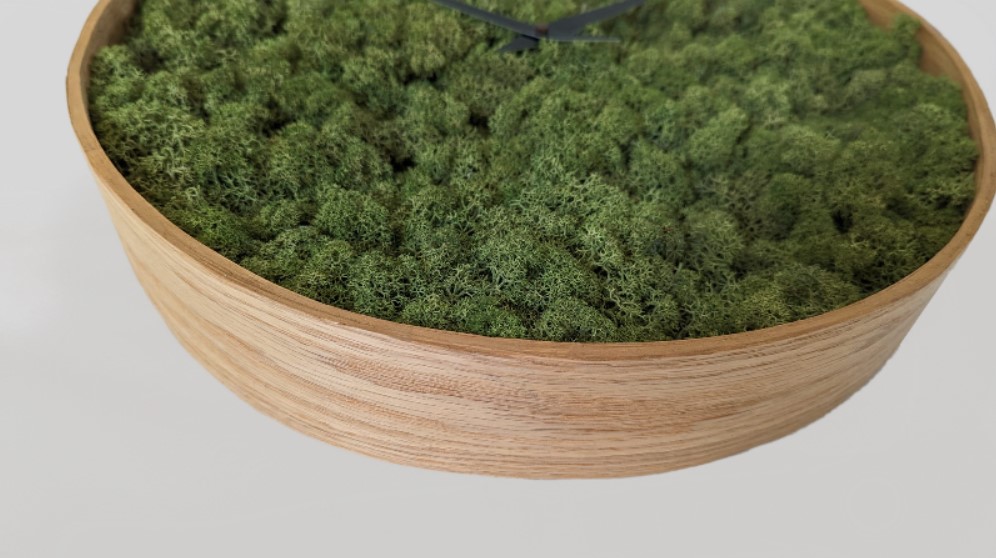 Klok van gelamineerd eikenhout en gepreserveerd rendiermos.