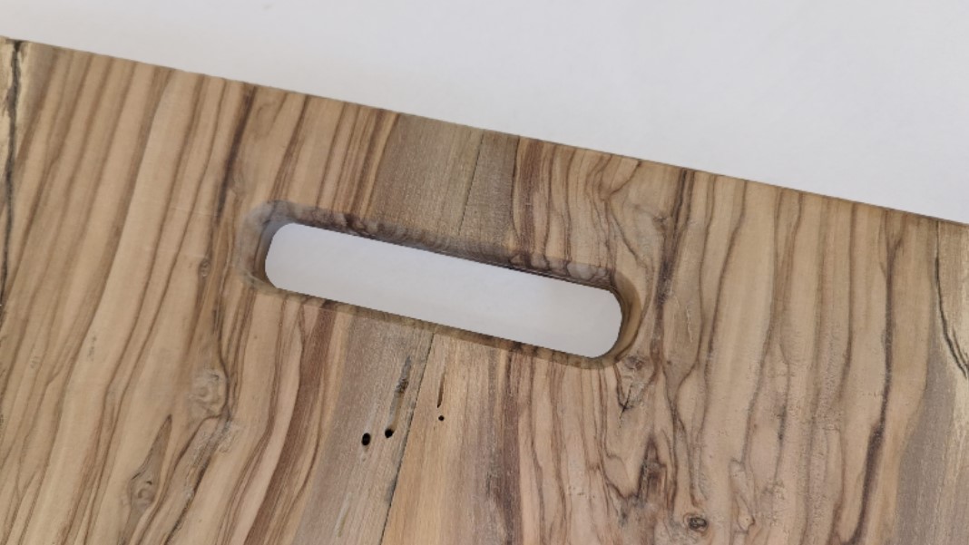 Serveerplank vervaardigd uit olijfhouten schaaldelen. Olijfhout is zeer kostbaar en duurzaam hout. Een olijfboom is doorgaans meer dan 100 jaar oud voor deze gekapt wordt.